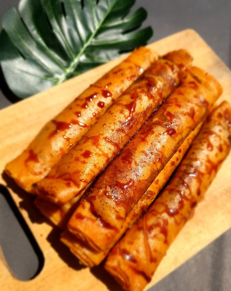 Ingredients: 3 bananas 24 spring roll skins, I use 15×15 size 50 gr powdered palm sugar Cheese How to Make: Step 1: Prepare the ingredients,