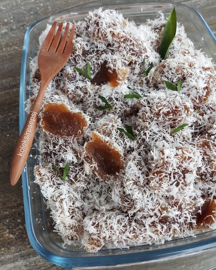 Ingredients: 1 kg grated cassava 1 grated coconut 3 tablespoons tapioca flour 1 teaspoon salt 4 tablespoons granulated sugar 200 grams palm sugar 3 pandan