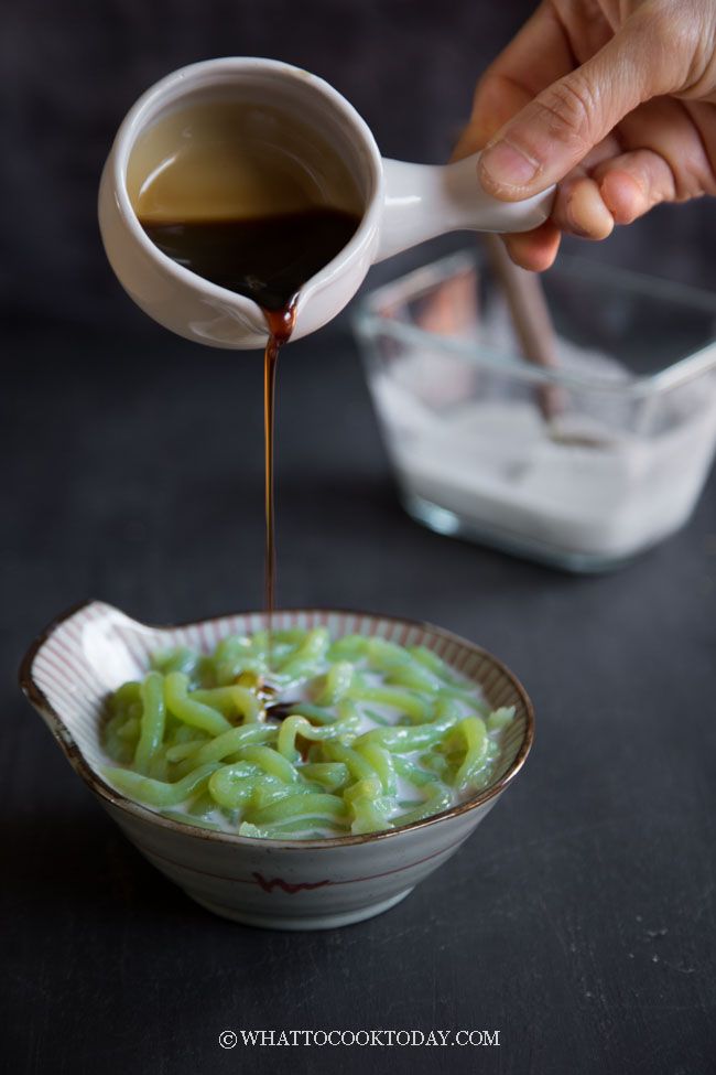 Ingredients: Cendol: 100 g rice flour 25 g tapioca flour/starch 500 ml pandan juice (blend 8-10 pandan leaves with water, then strain) Pinch of salt Palm Sugar Syrup: 200 g palm sugar (gula merah) 150 ml water 2 pandan leaves, knotted Coconut Milk: 400 ml coconut milk Pinch of salt Additional: Ice cubes Instructions: 1.
